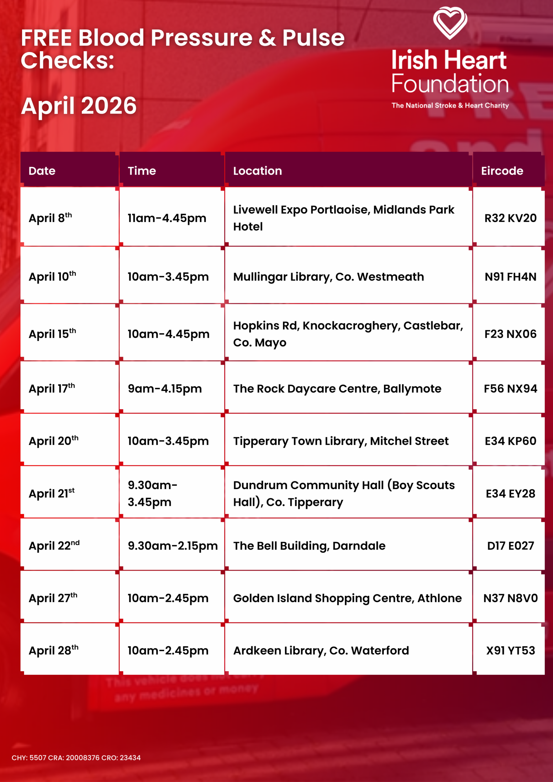 To book the MHU for your community please contact Hannah Maher on 087 3480432 or email healthchecks@irishheart.ie.