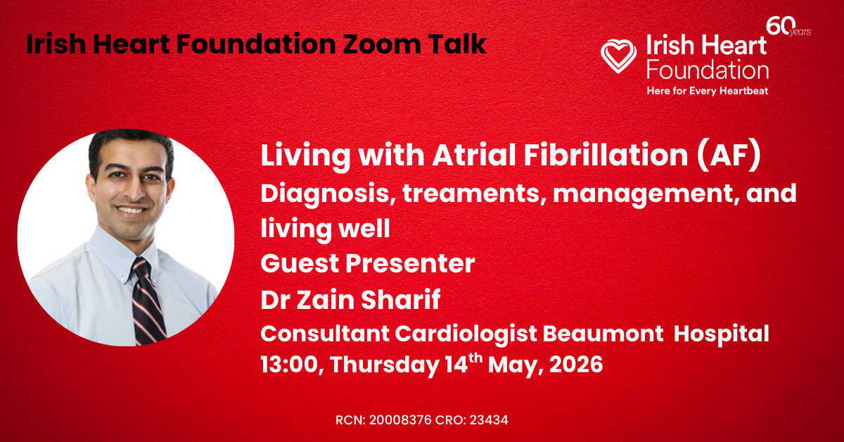 Dr Zain Sharif, Consultant Cardiologist, Beaumont Hospital, Dublin, will join us on Zoom on Thursday 14th May at 13:00 to give a talk on Atrial Fibrillation (AF, or AFib) and to answer your questions. The session will end at 14:00.