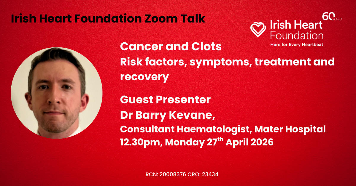 Dr Barry Kevane, Consultant Haematologist, Mater Misericordiae Hospital, Dublin, will join us on Zoom on Monday 27th April 2026 at 12:30 pm to give a talk on blood clots in people affected by cancer and to answer your questions. The session will end at 14:00.